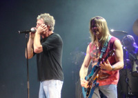 Finally managing to defeat the one way system, we stumble upon the venue, another new-ish, utilitarian shed, though seemingly more well thought out than many on the UK circuit these days. Arriving at just after 8.30pm, we hook up with Michael Richards, Steve Cole and Nigel Young and we ponder the lack of Styx who should have been on at 8. Backline is up and everything ready but no band. Finally, at around 8.55pm, they take the stage and perform a mere 15 minutes due to failure of their in-ear monitor system (Steve Morse later informed us). As I’m not a fan of their transatlantic sonic porridge, I’m hoping for more technical issues for them.